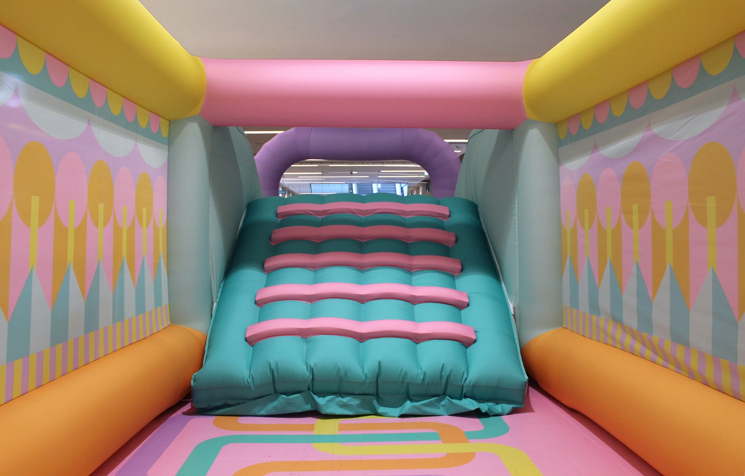 La structure ludique et gonflable a été conçue spécialement pour habiller au mieux l’espace mis à disposition par le centre et pour évoquer un sentiment d’émerveillement et d’interaction pour les plus jeunes.